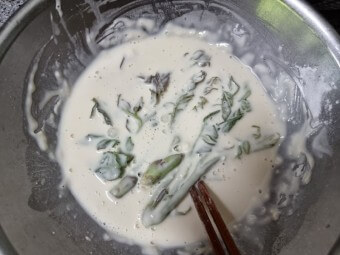 5. 두릅 전: 데친 두릅을 적당한 크기로 자르고, 밀가루 반죽을 만듭니다. 두릅을 반죽에 담가서 팬에 부침개처럼 얇게 부쳐냅니다.