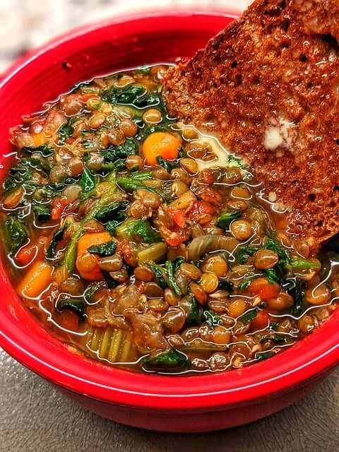 - 재료 : 렌틸콩, 양파, 당근, 셀러리, 마늘, 토마토, 채소 또는 닭고기 육수, 소금, 후추, 올리브 오일