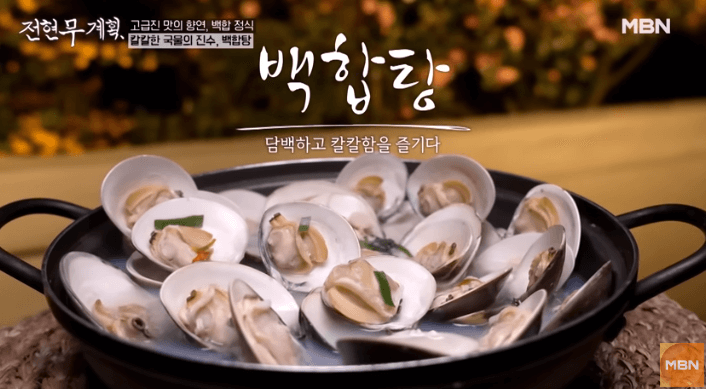전현무계획에서 백합조개 맛집 다은 회관에서는 백합정식을 주문했는데요. 백합 조개회, 백합 조개구이, 백합 조개탕, 백합 조개무침, 백합 조개죽까지 5가지 코스로 한 상 차려집니다.