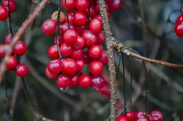오미자가 성숙하면 열매의 색깔이 짙은 붉은색으로 변합니다.